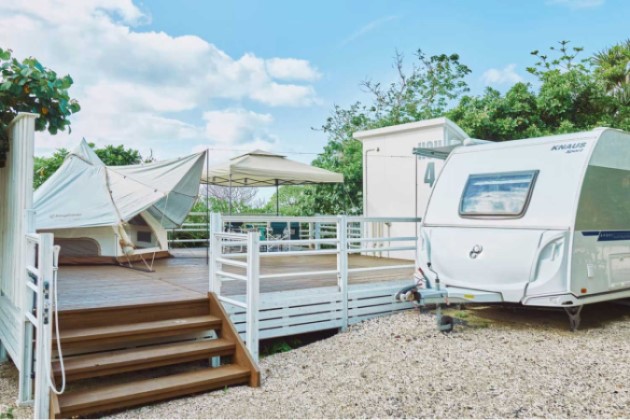 浜辺に泊まる。トレーラーハウスとプライベートデッキの1棟貸し宿泊施設です。