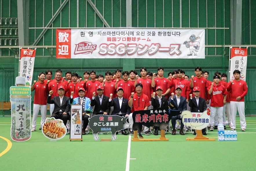 27日(月)に歓迎式が行われ、鹿児島県からは激励品としてかごしま黒豚を贈呈しました🐷SSGランダースが薩摩川内市で合宿を行うのは11回目です🎉